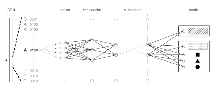 Pour cela, il faut tout d’abord convertir les quatre lettres A, C, T et G en langage binaire de 0 et de 1. Puis on entraîne des réseaux de neurones similaires à ceux qu’utilisent les algorithmes de reconnaissance d’images, utilisés par exemple pour numériser des documents manuscrits ou pour analyser les images des caméras embarquées de véhicules autonomes.